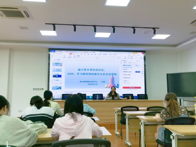 在讲到ADHD学生支持策略时候,丁老师指出ADHD学生的特点是对于细小的事情完全缺乏注意力,对任何事情总是没有想清楚就开展行动,在规定要安静的场合,还是会不停地扭动身体,自言自语。针对性的支持策略包括语言唤起学生的注意,多使用有趣可引发学生动机的教学具。采用多媒体教学方法,以提高学生的学习兴趣。将视觉刺激单纯化,一次只呈现单一学习材料。将活动时间缩短,以此达成教育目标。
