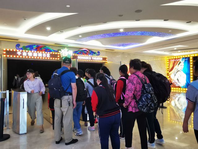 随后学生们乘坐电梯,前往剧场观看《上海千古情》表演,一个小时的表演中,演员将上海从古至今的历史变迁与发展用精美的编排展现在眼前。舞姿优雅,音乐动听,当序幕拉起,仿佛穿越漫漫时空长河,大上海不同时期的经历和故事画卷迭宕起伏。或纯朴、或梦幻、或激情、或沉重、或诙谐,高科技的舞美光效,加上精巧的故事,把上海历史的厚重与现代的活力交织在一起,如诗,似画。同学们的阵阵掌声不但是对演员塑造角色的认可,同时也是被剧中人物的情感所感染,这场演出让同学们对历史的理解更加深刻。