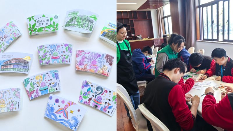 为了确保每一位学生都能跟上课程进度,星巴克的培训师们用缓慢而清晰的语言结合现场实物和技术展示了每一个步骤,学生们也全神贯注地观察、学习和模仿。课程内容涵盖了咖啡豆的选择、研磨以及最终的冲泡技巧等内容。学生们在老师的指导下亲自操作,实践如何精确控制水温和咖啡粉的量,以及如何运用手冲壶制作出香醇的咖啡。学生小高和小谭在亲自操作后,收获了老师和同学们的点赞和对他们学习成果的认可,他们对老师们说:“很高兴能参加这次培训。学会了本领后,我们就能给家人和朋友做咖啡了!将来,咖啡师也会成为我们的职业选择之一。”课程中,同学们还为星巴克咖啡杯手工绘画了美丽的杯套,并被培训老师收集起来带回星巴克金山万达门店进行展示。
