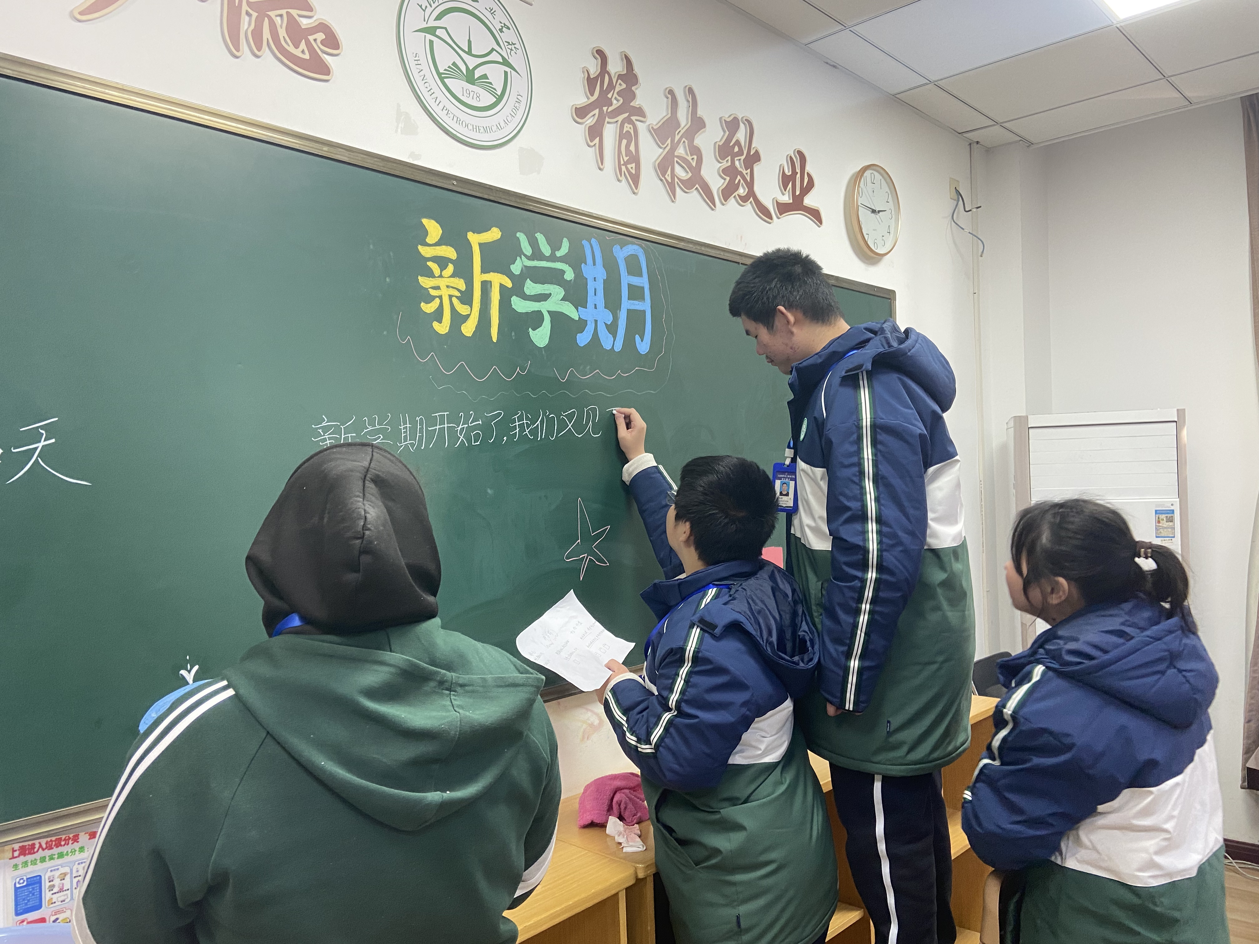 在教室的后墙上,一块黑板正悄然发生着变化,它将成为新学期班级的文化窗口,承载着大家对新学期的美好憧憬。同学们分工合作,拿起粉笔小心翼翼地在黑板上描绘着,每一笔都饱含着对新学期的期待。这块黑板报不仅是一件艺术作品,更是全班师生共同努力的结晶,它展示了特教班级独特的文化氛围,也为新学期的到来增添了一份浓厚的色彩。