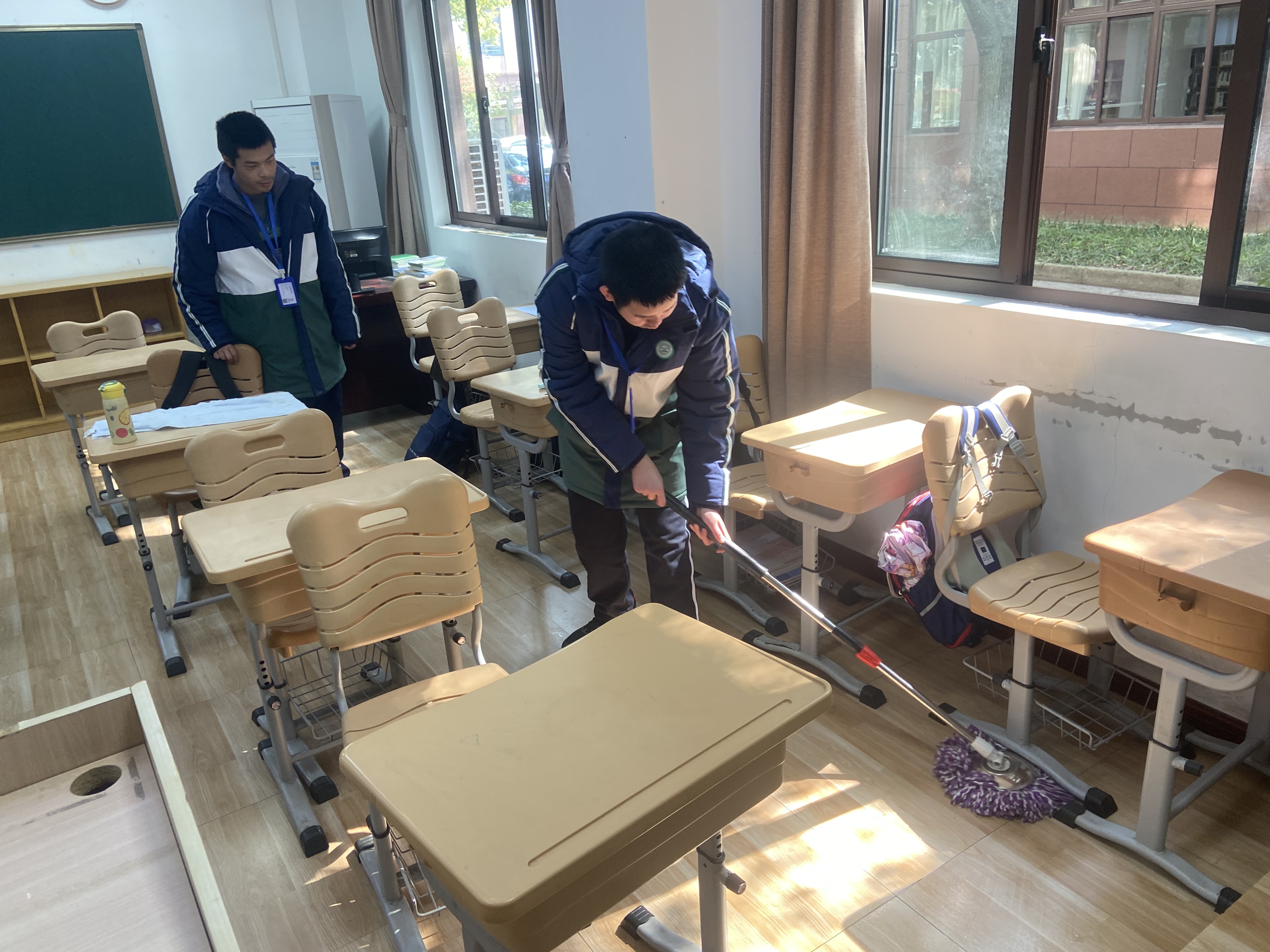 走进教学楼,在班主任和教辅老师的带领下,同学们纷纷拿起清洁工具,投入到教室卫生打扫中。有的同学认真地扫地,不放过任何一个角落;有的同学则负责拖地,他们用力地推动着拖把,将地面拖得光亮如新。对于一些特殊教育学生来说,完成这些任务可能需要付出更多的努力,但他们在老师的耐心指导和鼓励下,依然积极地参与其中,努力把自己负责的区域打扫干净。同学们相互帮助,团结协作,大家齐心协力,为打造一个干净、舒适的学习环境而努力。