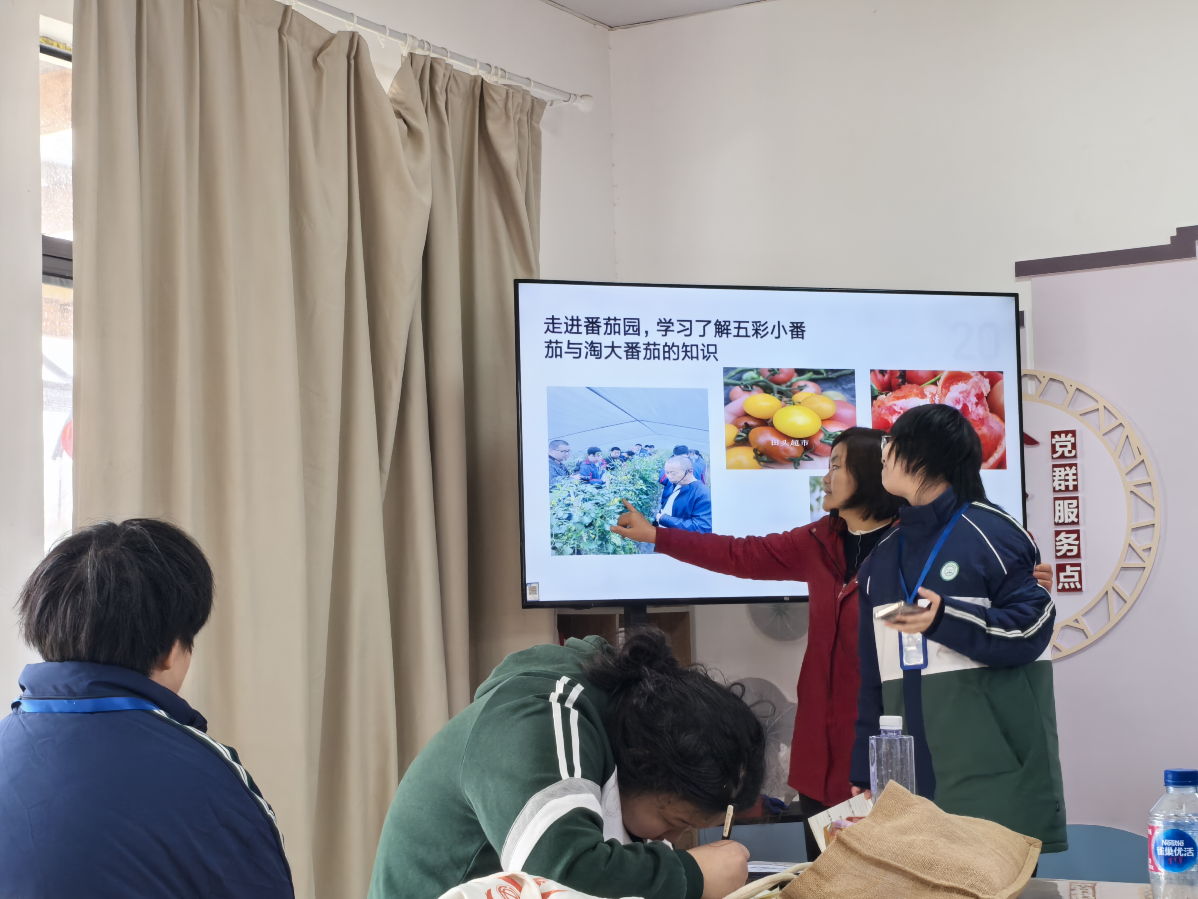 上午的活动分了三个环节,首先由左金莲介绍田头超市经营业务,并重点介绍了合作社的主打产品,同时,还分享了学姐、学长们在田头超市的工作照片,鼓励学生们也可以通过自身努力认真做好工作。她还特别强调了在田头参观学习时应该注意的安全事项。钱贵平还带领学生们来到金山特“枣油桃”和“五彩小番茄”的种植田地,组织学生们近距离认识抽芽的桃树与番茄,在大自然中学习知识,感受生命的奇妙。为了帮助学生建立良好的学习习惯,左金莲还耐心地组织学生们及时总结实践学习的知识,引导学生们使用AI手机功能,分享和拓展今日所见所听所学内容,大大丰富了学生们对番茄和桃树的了解,更增强了学生对农业知识的理解和兴趣。