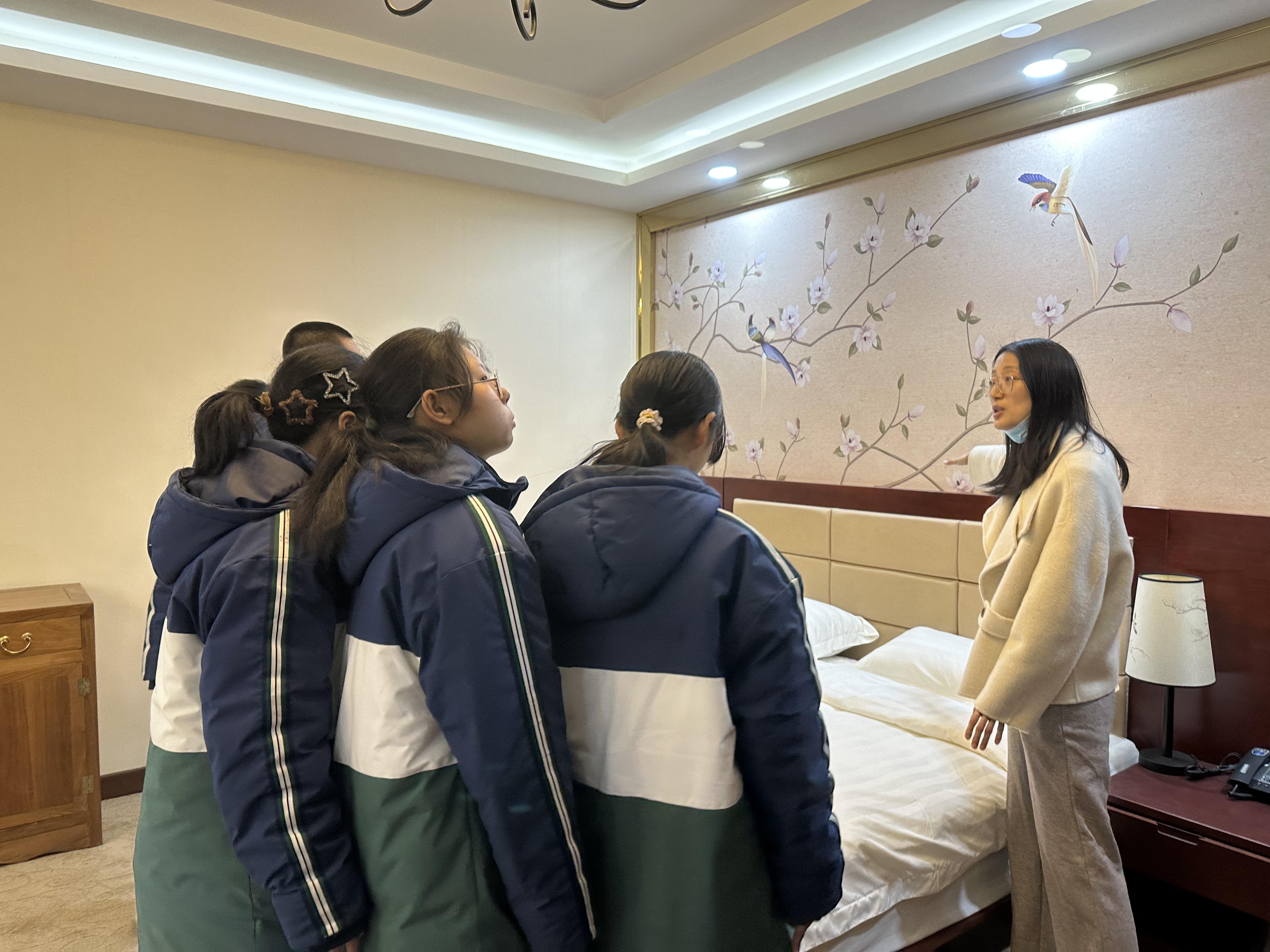在烘焙实训室,香甜的气息弥漫四周,学生们好奇地观察着各种烘焙设备,老师逐一介绍各种设备的功能和使用方法,学生们眼中闪烁着跃跃欲试的光芒。餐厅实训室里,优雅的餐桌布置与规范的服务流程让学生们感受到服务行业的专业与细致。而客房服务实训室更是吸引了众多目光,这里拥有大床房、标准间和豪华套间三个不同规格的实训室,学生们在这里学习如何整理床铺、布置房间,了解客房服务的各项细节。