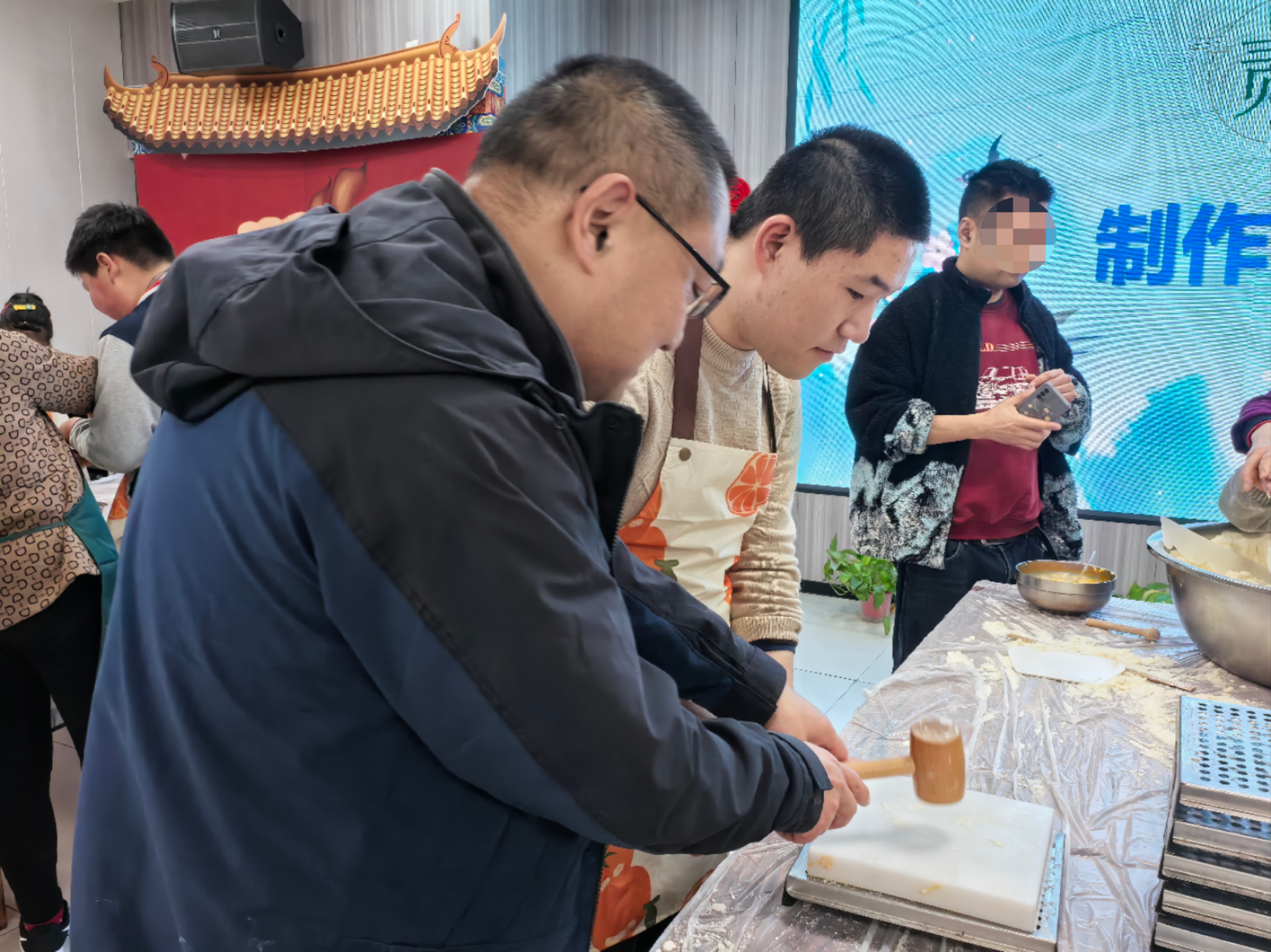 活动现场,孩子们在老师和家长的耐心引导下,学习制作金山特色方糕和清明时令青团。筛粉、包馅、压模……每一个步骤都成为孩子们感知生活、表达情感的窗口。一名学生在母亲的辅助下,专注地将豆沙馅裹进外皮中,最终完成了一个圆润的青团,露出满足的笑容;另一名学生则对模具压制的方糕充满兴趣,反复尝试后骄傲地向老师展示自己的作品。