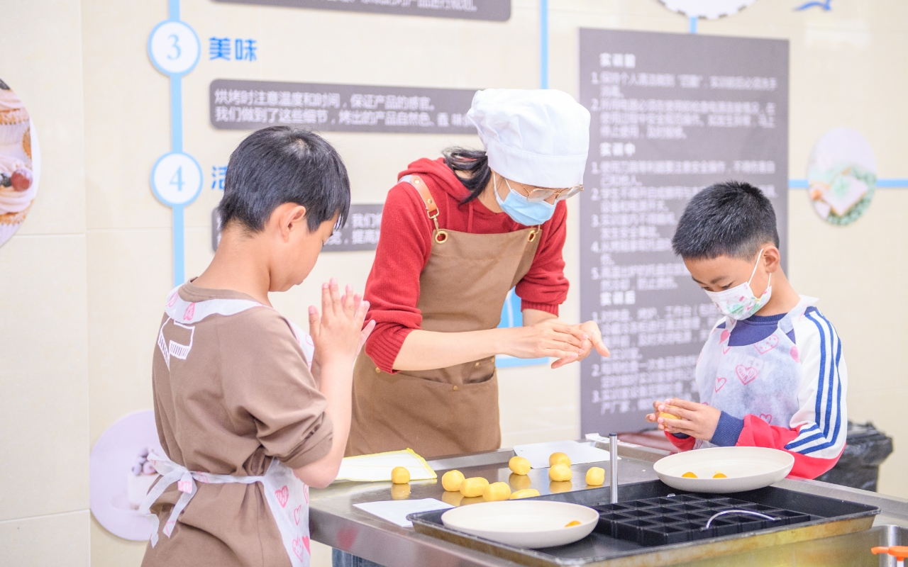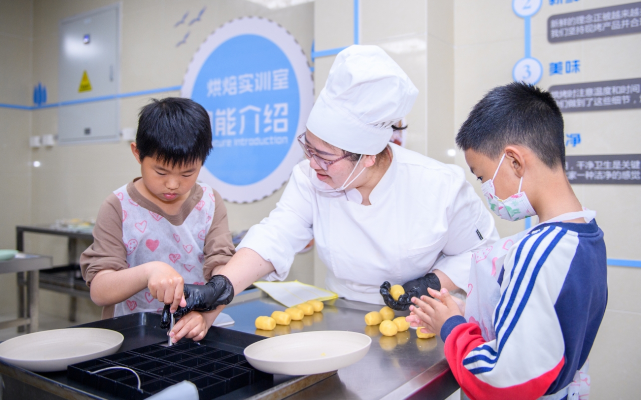 中式面点体验区香气四溢,来自金山区各中小学的学生们在高级面点师殷洁的指导下亲手制作传统凤梨酥,学习酥皮擀制、凤梨馅包裹及成型技巧,感受中式点心“酥香化口”的精妙工艺。活动对接中式面点师、烘焙师及食品加工等岗位,帮助青少年了解职业特点与技能要求。现场气氛热烈,学生们专注揉捏、塑形,当金黄酥脆的凤梨酥新鲜出炉时,成就感溢于言表。活动不仅弘扬了传统美食文化,更在劳动实践中播撒了职业梦想的种子。