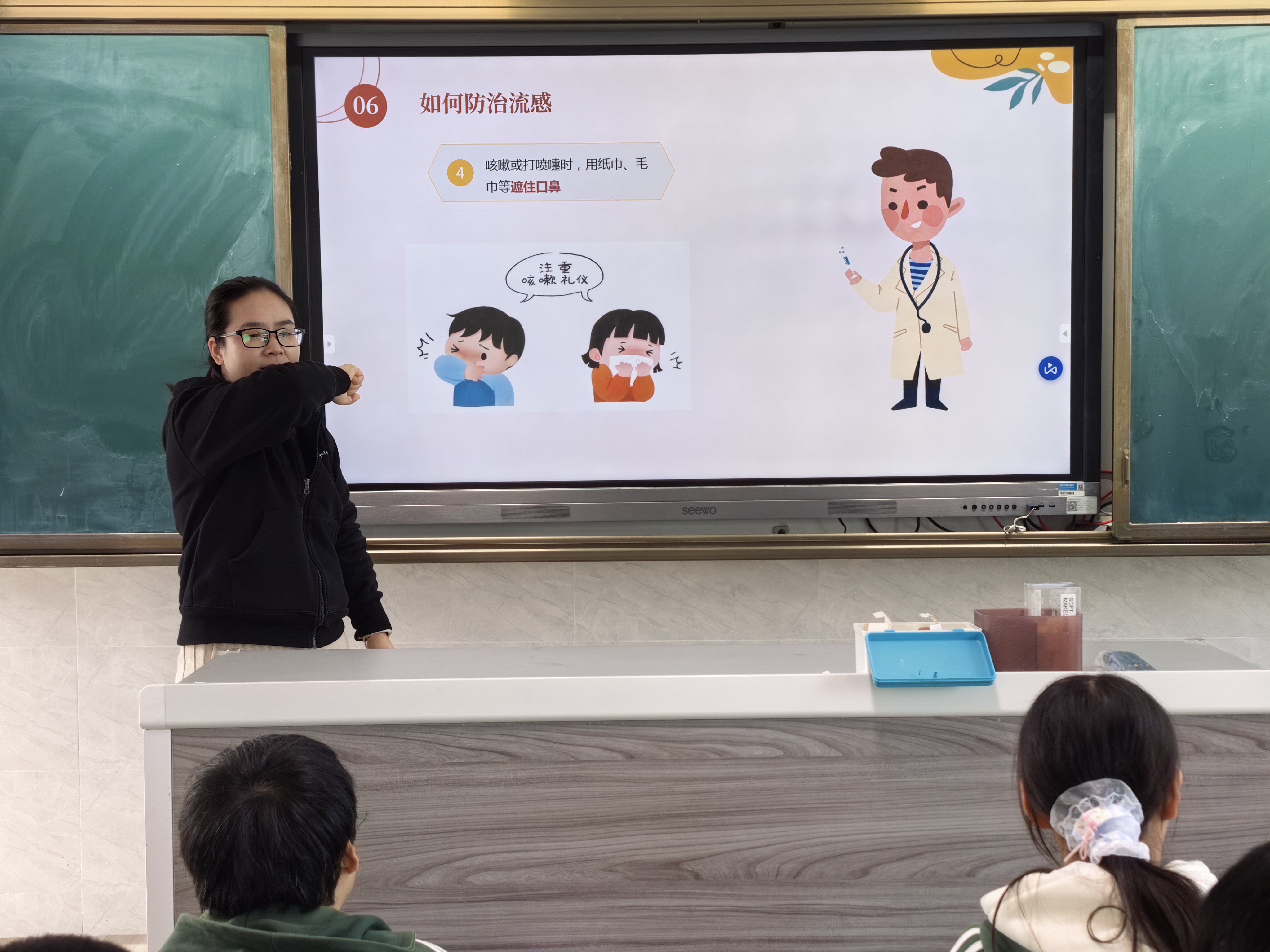 围绕“如何有效预防流感”这一核心问题,倪莉莉又进行了重点讲解,并提炼出几大关键防护措施:接种流感疫苗、保持良好的个人卫生、流感流行季节尽量避免去人群聚集场所、注重咳嗽礼仪、避免交叉感染、均衡膳食、增强体质等。在宣讲之后倪莉莉还设计了一些小问题帮助学生们加强巩固预防流感知识。