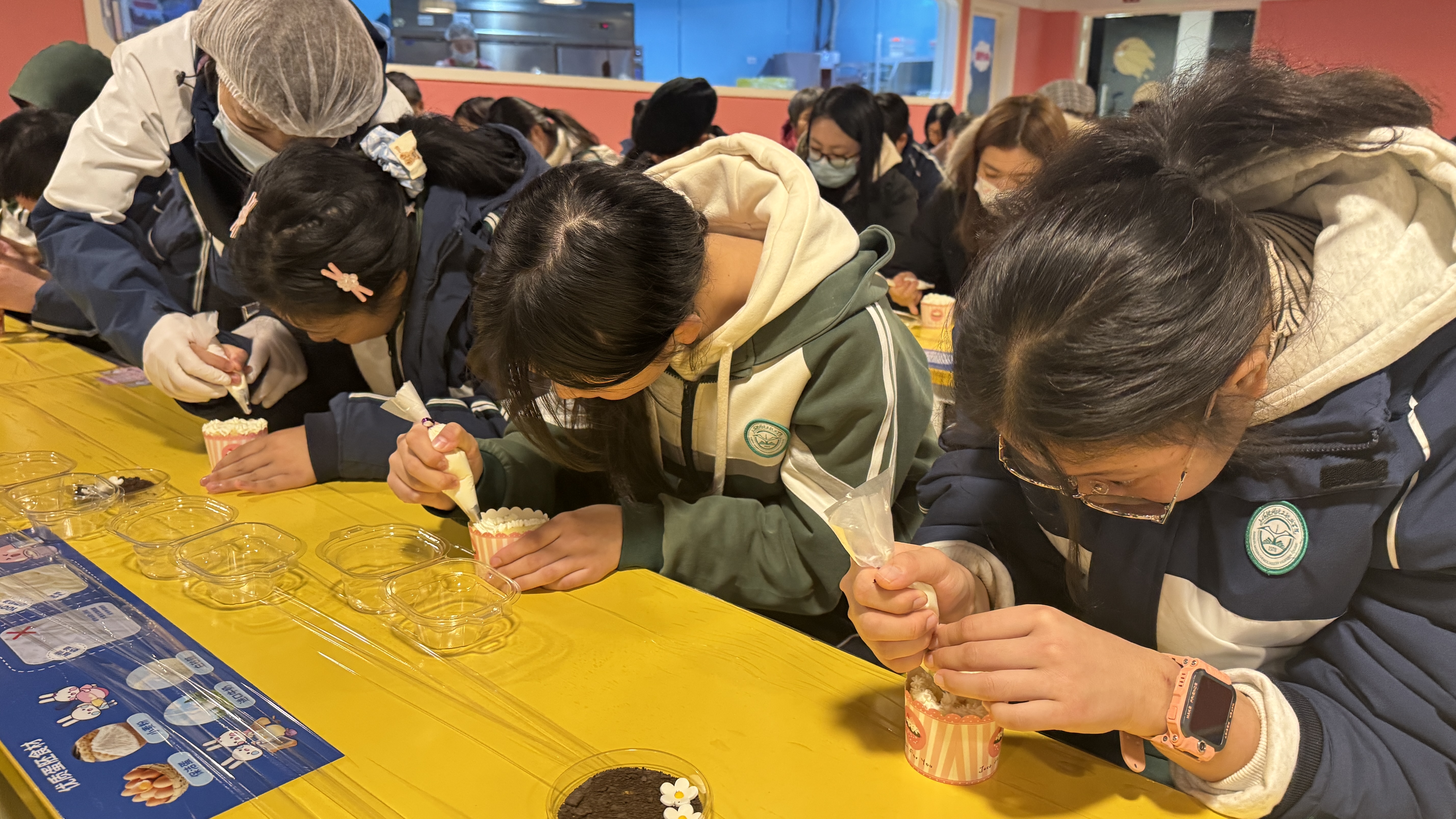 随后,最令人期待的蛋糕DIY环节到来。在温馨的体验教室里,同学们化身“小小烘焙师”。在老师和工作人员的辅助下,他们充分发挥自己的想象力,将香甜的奶油和饼干点缀在蛋糕上。每一步都充满了新奇与挑战,当一个个独一无二、充满童趣的蛋糕作品在自己手中诞生时,每位同学的脸上都洋溢着自豪与喜悦的笑容。这不仅是手脑协调能力的锻炼,更是收获成就感的美好过程。