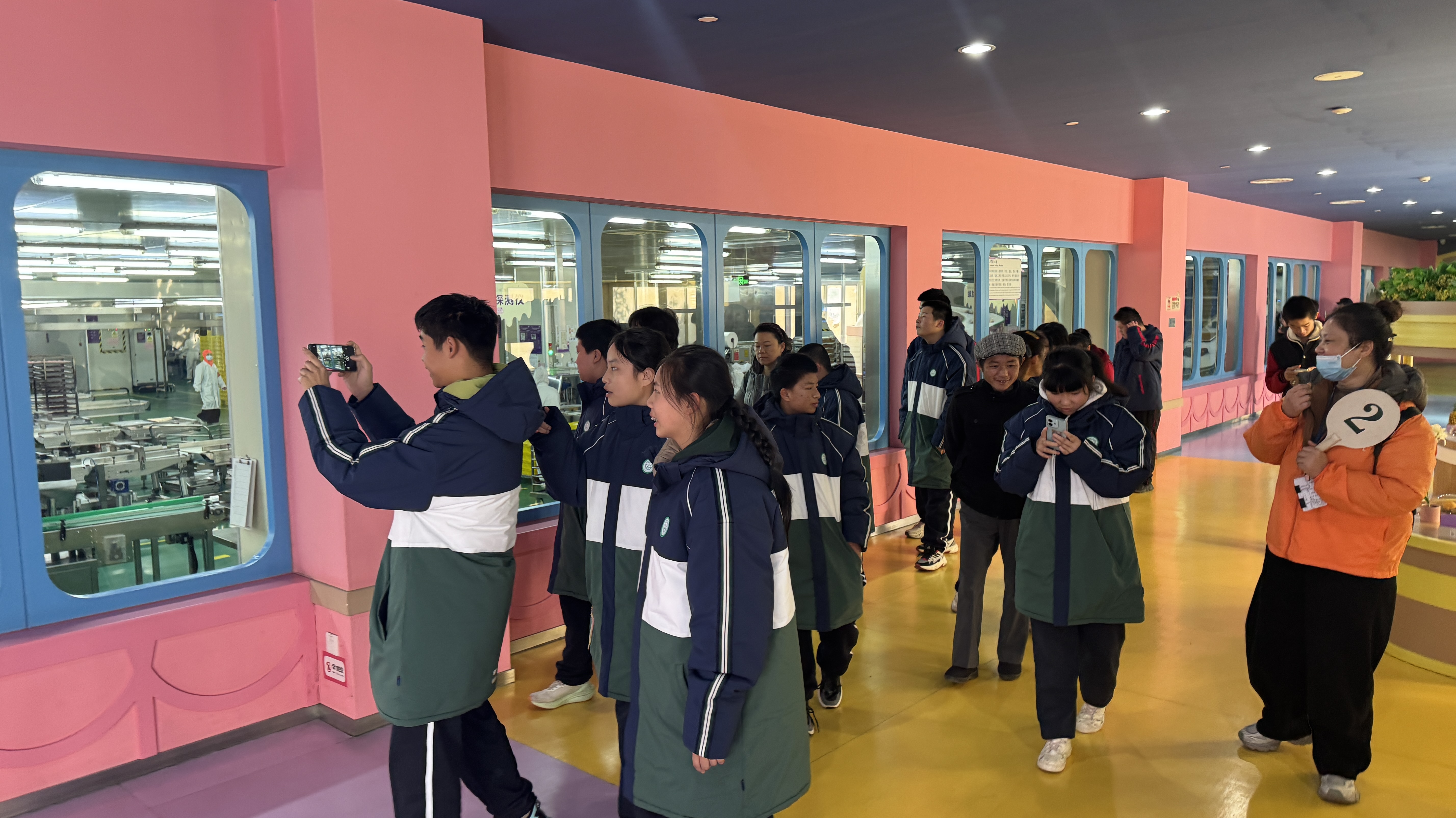 清晨,沐浴着和煦的秋日阳光,同学们满怀期待地抵达本次活动的第一站——元祖梦世界。在工作人员的耐心引导和讲解下,同学们有序地参观了现代化的蛋糕生产流水线。透过明亮的玻璃窗,大家好奇地观察着从原料搅拌、模具成型到烘烤、装饰、包装的每一个环节。自动化设备的精准操作和工人们严谨专注的工作态度,给同学们留下了深刻的印象。这不仅仅是一次简单的参观,更是一堂生动的“职业启蒙课”,让同学们对社会生产劳动有了直观的认识。