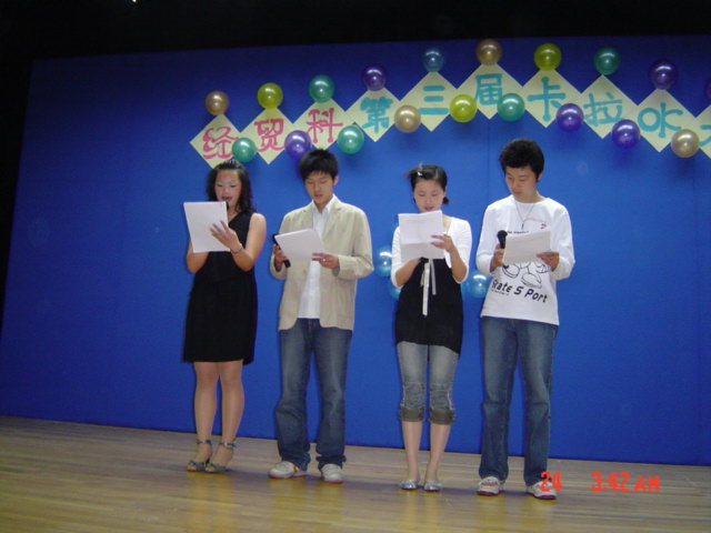 4月24日下午15:30,经贸科在B区报告厅举行了第三届卡拉OK大赛,邀请了学生处的黄黎明副主任、团委杨金副主任、经贸科贾佩新科长、校办薛舒老师及学生处的冯楠老师参加。
