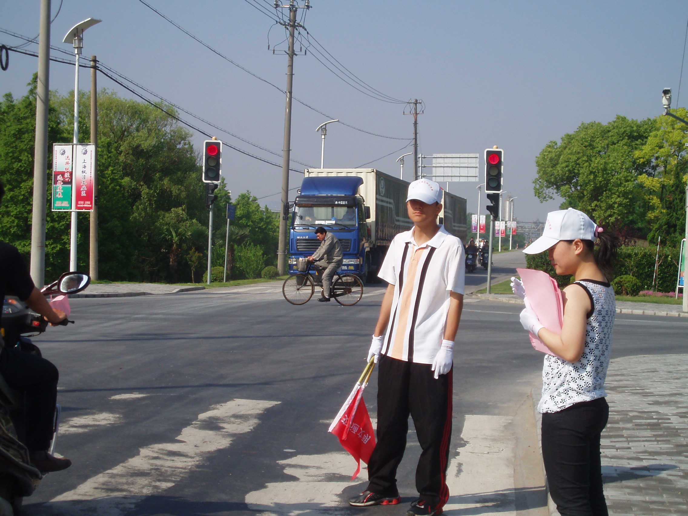 5月27日、28日双休日早晨7:30~8:30,在大堤路和荔浦路口,我校学生志愿者和老师志愿者戴起白手套,举起小红旗,当起了交通协管员。“红灯停,绿灯行”倡导每位行人严格遵守交通规则,做文明金山人。