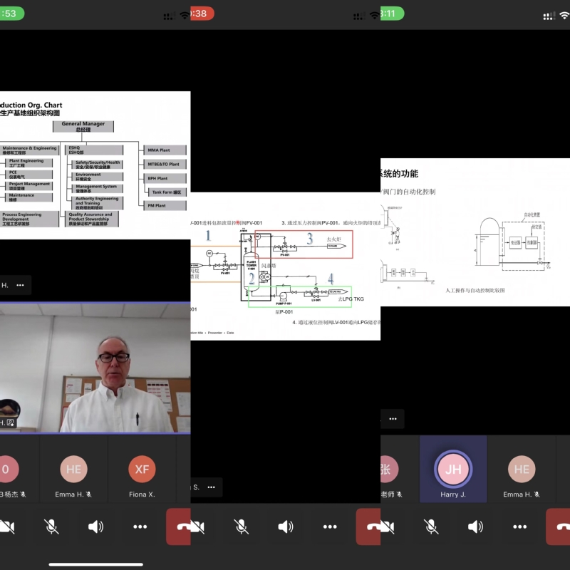 在四天的线上授课中,罗姆化学上海有限公司的培训师们分别围绕罗姆化学企业文化、环境保护、质量管理体系、现场仪表、DCS系统及装置联锁系统、动静设备、工艺技术(吸收解析、蒸馏精馏)等内容展开,拓宽了学生的知识面,加深了知识在企业生产中的应用体验,为同学们后续顺利进入企业工作打下了一定的基础。