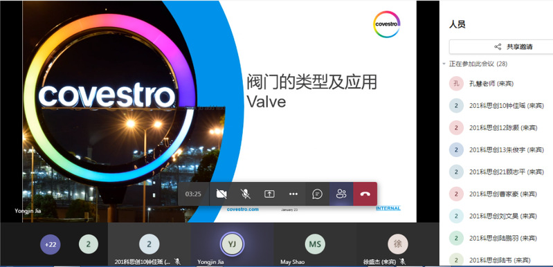2023年元旦过后的第一周,也是本学期最后一个教学周,201科思创班原计划到科思创企业进行的跟班实习因受疫情影响改为线上学习。这是该班学生第二次参加企业的实践培训,虽然未能到厂区实地参观学习,但是在科思创培训基地与学校相关部门的努力下,企业众多专家与老师齐聚线上Teams课堂,为201科思创班的25名同学带来了为期四天精彩与充实的教学讲座。