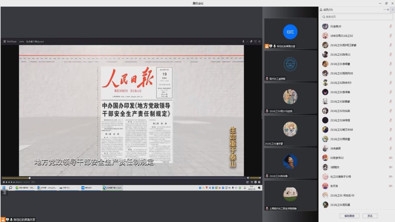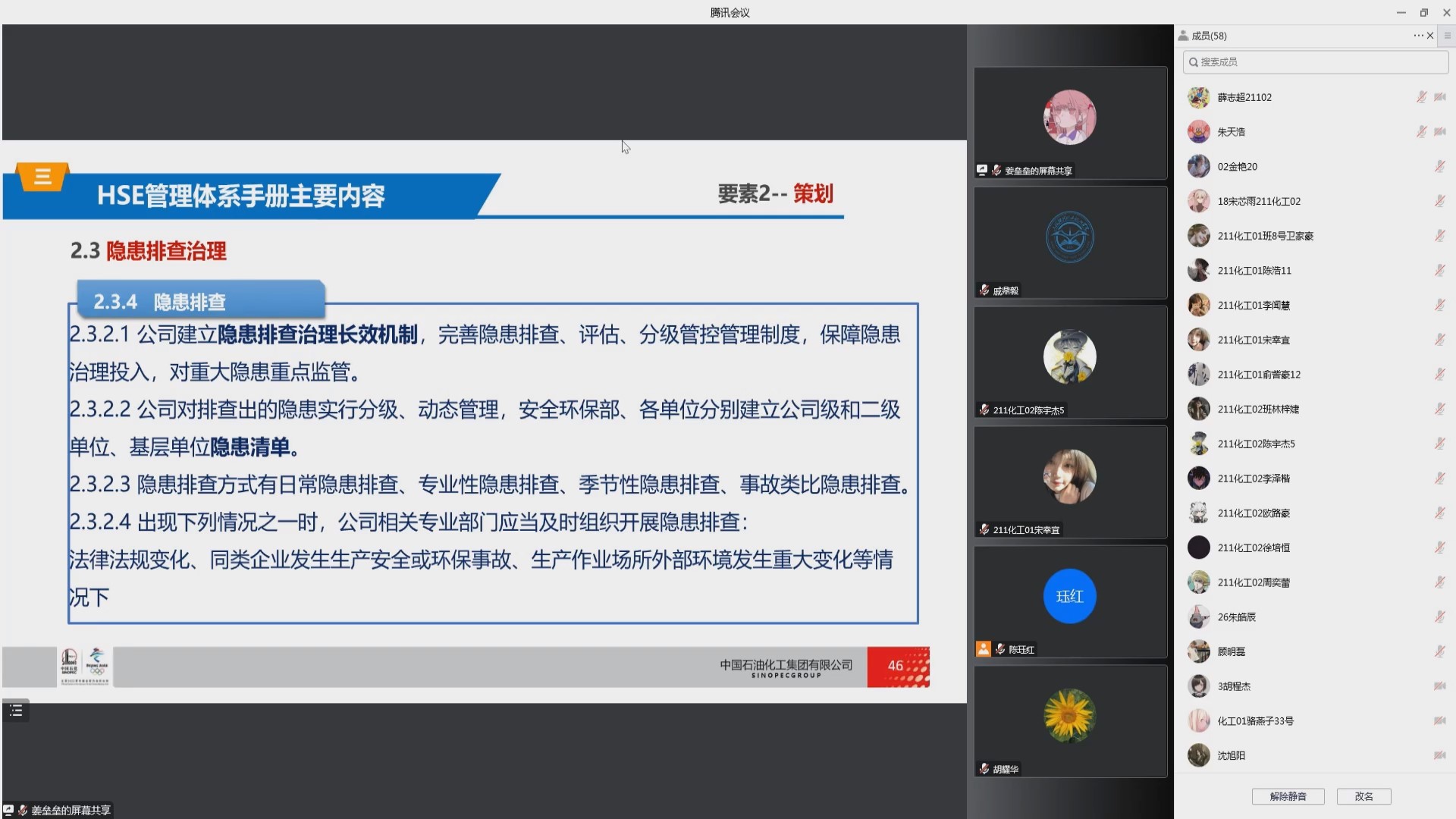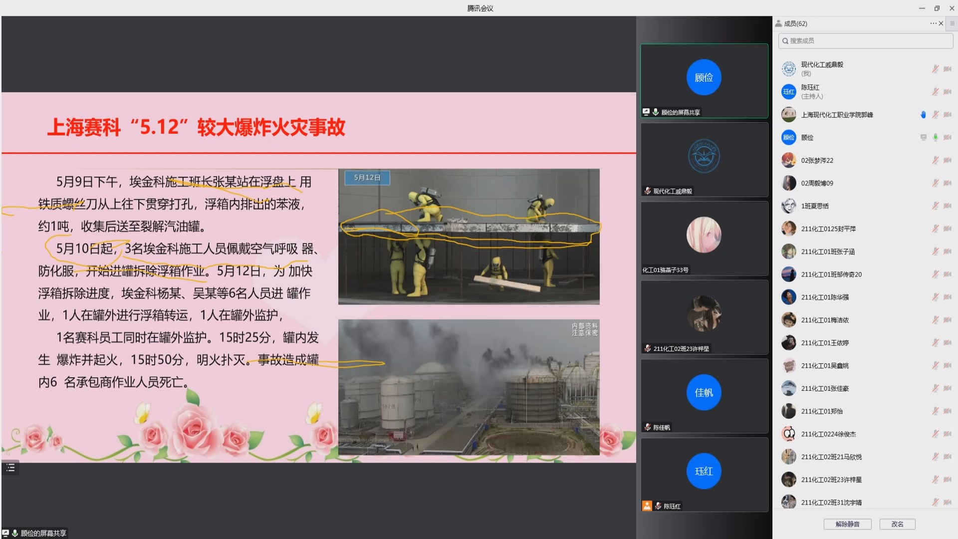 本次课程涉及上海石化生产装置概况、HSE体系、安全生产制度与企业文化,同时结合环保与清洁生产知识、安全生产事故案例分析、职业卫生健康及现场急救知识操作,最终由同学们进行线上学习汇报。