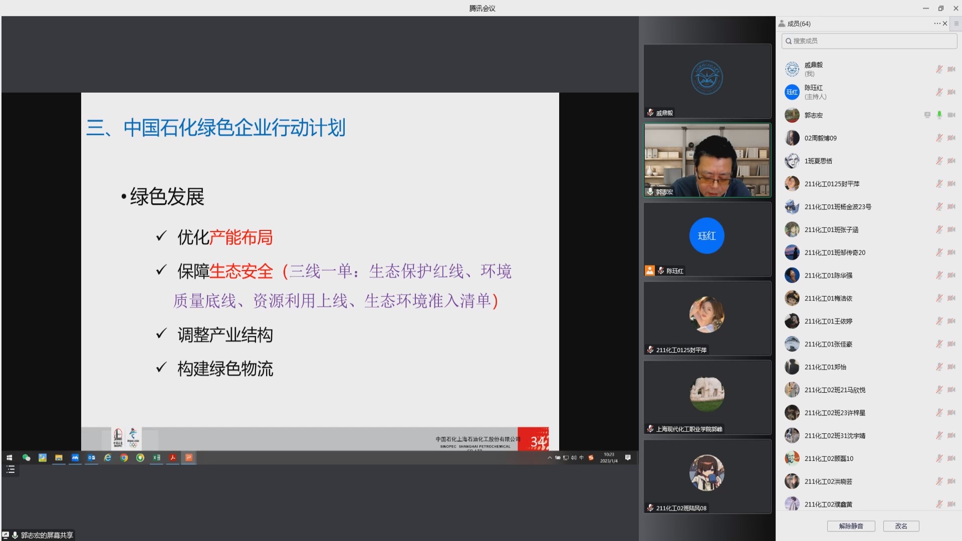 1月4日上午由上海石化安全环保部郭志宏专家带来上海石化绿色企业建设也即上海石化企业文化的课程,郭老师以上海石化的绿色企业建设过程为主线,依次讲解上海石化概况、企业发展面临的环保形势、中国石化绿色企业行动计划、推动绿色企业建设和环保转型与持续推进绿色企业建设情况。公司紧紧围绕“生态文明思想”着力绿色发展,向先进水平挑战、向最高标准看齐。2010年,公司被中华环保联合会授子“中华环境友好企业”称号,2018年公司荣获集团公司环保先进和绿化先进单位,直到目前2020年绿地率40.5%,绿化覆盖率42.2%。郭老师为什么建设、建设什么、怎样建设三点切入讲解,让同学们对现今的环保态势、化工行业绿色企业建设有了一个初步的了解。