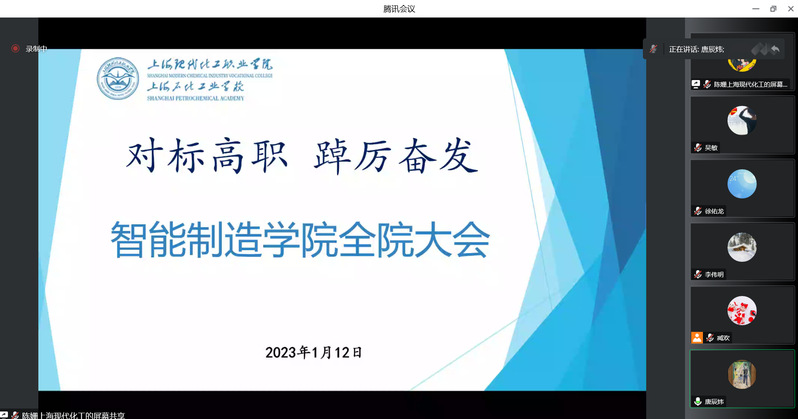 1月12日上午,为全面总结本学期的各项教育教学工作,并提前规划和部署下学期的各项重点工作,智能制造学院通过腾讯会议平台组织召开线上全体教职工大会,会议由学院支部书记唐辰炜主持,我院全体教职工参加了本次会议。