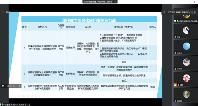 首先,陈姗回顾了本学期的教学工作,对本学期线上教学工作的顺利结束感到欣慰,十分感谢各位教师的艰辛付出和对学院工作的支持。陈姗对本学期结束时的教学工作文件和下学期的教学计划、时间节点以及教学文件的细节问题和过程性的教学文件的提交给以提示,最后,陈姗就学校信息化教学工作推进,智慧教学系统案例撰写等提了要求和做了假期工作布置。