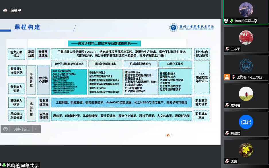 为持续深化落实新高职人才培养目标,进一步优化高分子材料智能制造技术专业人才培养方案,夯实新高职人才培养的基础,以高质量人才培养方案设计引领高分子材料智能制造技术专业建设。2月1日下午,化学工程学院高分子材料智能制造技术专业人才培养方案指导会在线上举行。本次指导会由化学工程学院院长胡迪君主持,邀请徐州工业职业技术学院材料工程学院副院长、徐州市聚合物基复合材料工程中心主任柳峰做人才培养方案指导工作,挂职副校长严小丽,化学工程学院副院长沈端,以及申报团队成员和骨干教师等相关老师共同出席了此次会议。