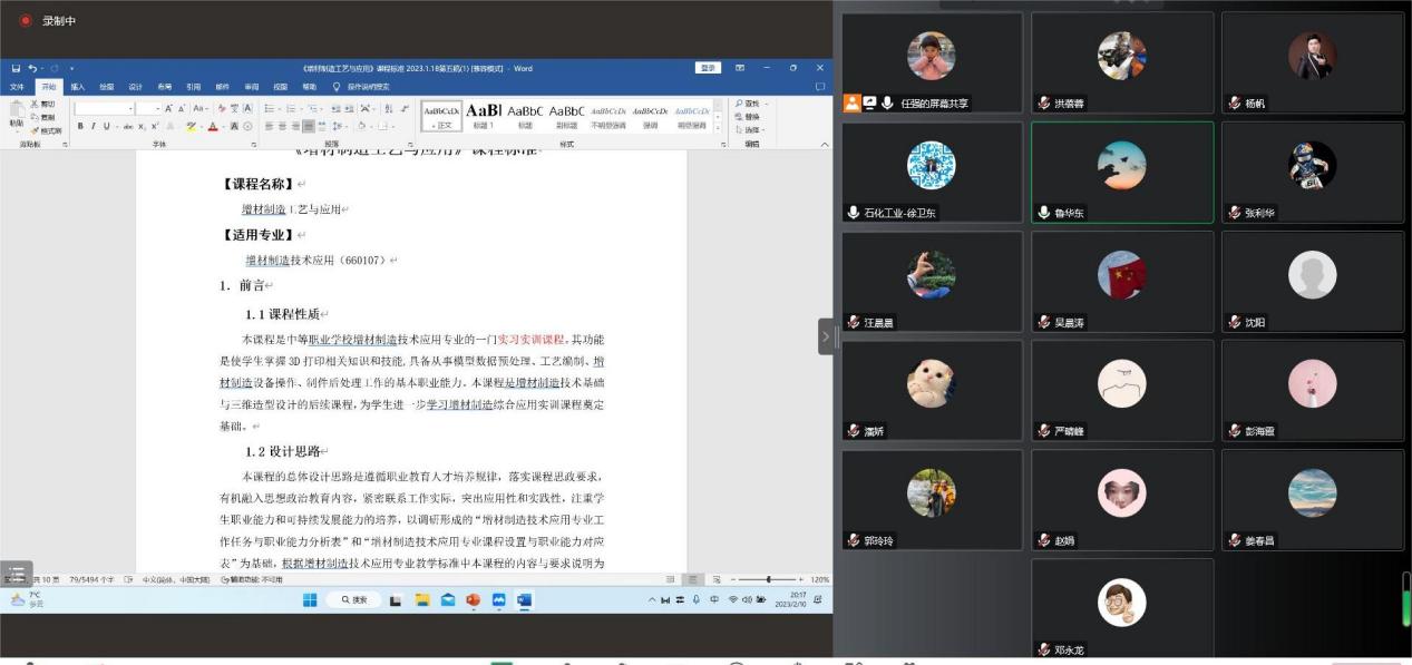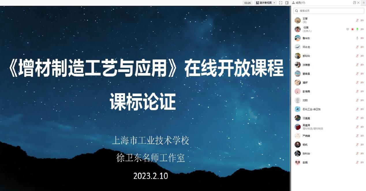 2月10日,上海市工业技术学校《增材制造工艺与应用》在线开放课程团队联合市徐卫东数控名师工作室,一起开展市级课程《增材制造工艺与应用》的课标论证线上研讨会。会上,上海工程技术大学高职学院机制教研室主任张利华、上海市产业技术创新促进会主任吴晨涛、上海市中职数控名师工作室主持人徐卫东等分别发言。会议由增材制造教研组组长任强主持,加工制造部主任鲁华东、副主任潘娇、《增材制造工艺与应用》在线开放课程团队成员以及徐卫东名师工作室全体成员参加本次研讨会。工作室成员洪蓓蓉同时作为课标开发团队成员组织了本次课标研讨会。