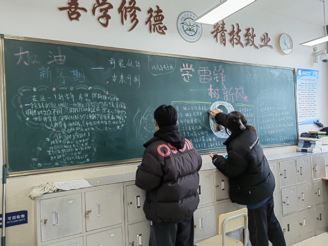 在打扫卫生的同学们忙得热火朝天的时候,教室后面黑板报的角落里同样干劲十足,本次黑板报整合了开学迎新、安全宣传、学习雷锋好榜样的主题,各班级负责出黑板报的同学通过前期的计划、寻找资料,今天正式开工了。你画图来我写字,有条不紊地慢慢勾勒出了本期黑板报的雏形。