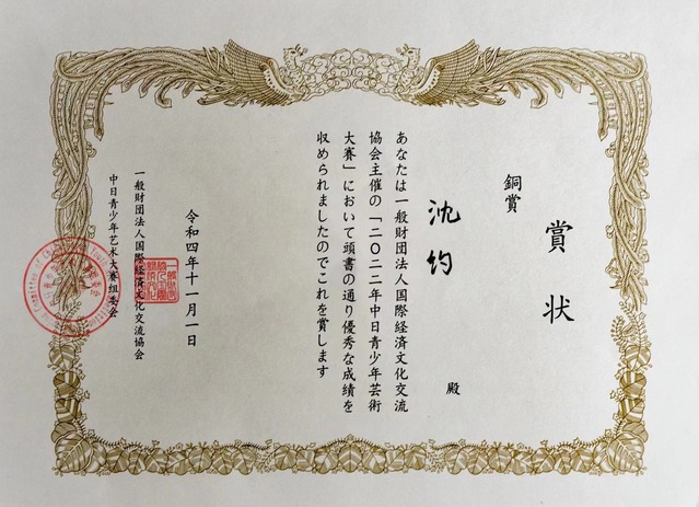 2022年是中日邦交正常化50周年,大赛吸引中日两国几千名学生踊跃参赛,得到了中日两国相关部门的大力支持。同年11月23日在日本九州国立博物馆举办了授奖仪式和日本巡展。上海现代化工职业学院经贸学院201物流班沈约同学一路过关斩将,荣获摄影类铜奖,成为我校历史上第一位参加国际比赛的获奖者,实现了零的突破。由于疫情的特殊原因,近期收到了日本发出的获奖证书。