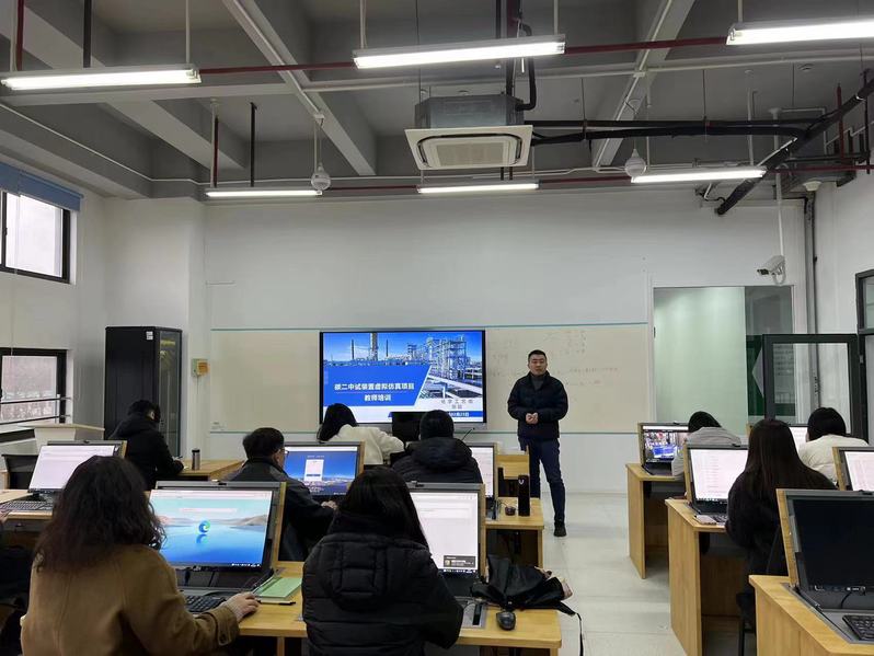 为进一步推进我校虚拟仿真实训基地的应用,加强化学工程学院教师虚拟仿真教学实践应用能力,化学工程学院组织并开展了“碳二中试装置虚拟仿真实训项目”主题系列培训。2023年2月23日,张超作为主讲老师,在化工综合实训大楼三楼302教室进行了“碳二装置软硬件介绍及教学实施概述”主题培训,学院领导和老师参加了此次培训。