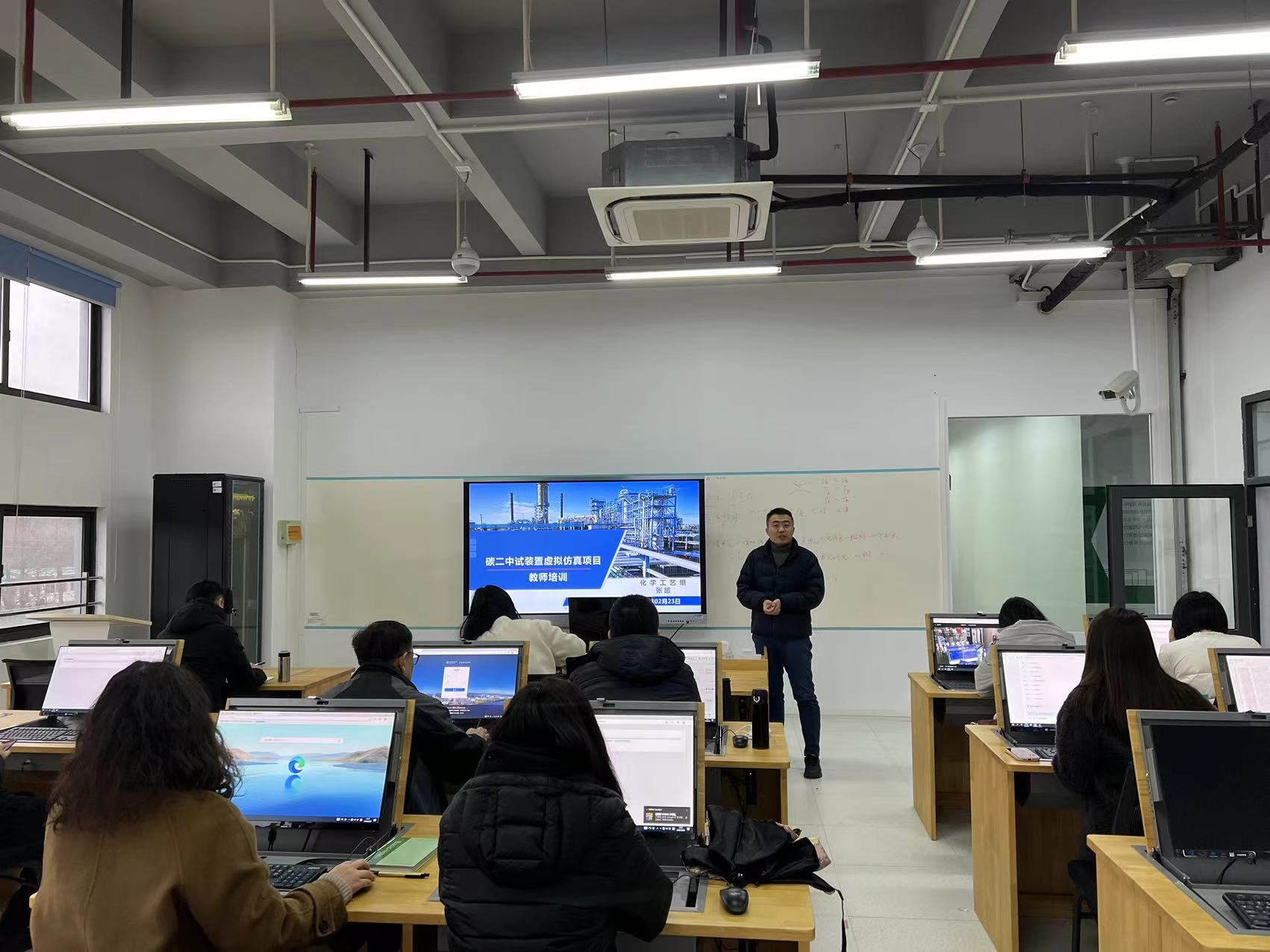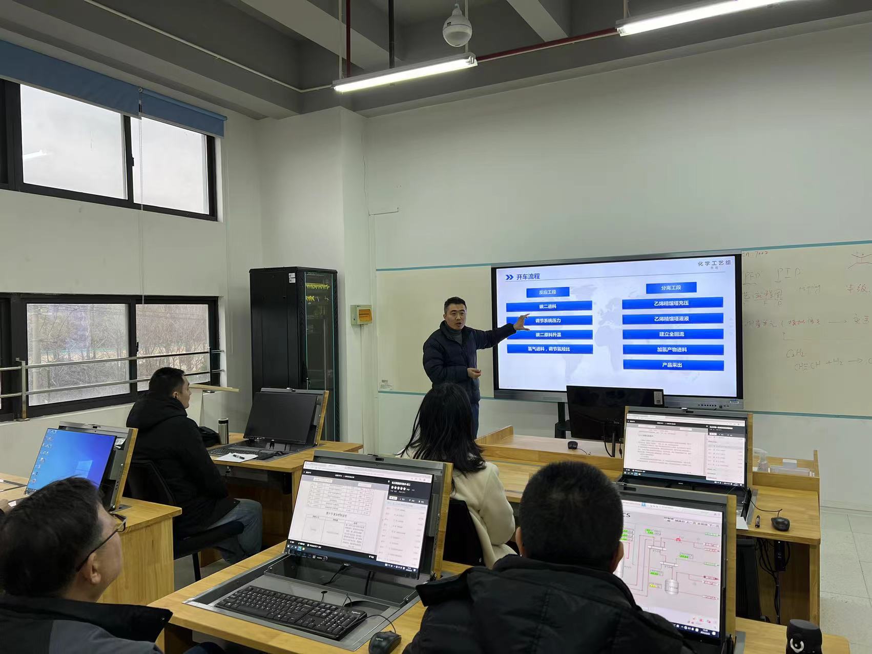 培训分三期进行,主题分别为碳二装置软硬件介绍及教学实施概述、虚拟技术应用培训、装置故障处理及事故应急处置。第一期由化工学院化学工艺组张超老师主讲,15位教师参加培训。张超首先总体介绍了碳二加氢装置工艺流程,讲解了中央控制室DCS系统的功能和操作方法,接着对装置开停车操作流程进行了详细说明,还介绍了装置工艺异常及系统联锁处置方法,演示了获取和上传学生实训数据的方法,详细讲解了可视化风险预判书的评价维度及应用方法。