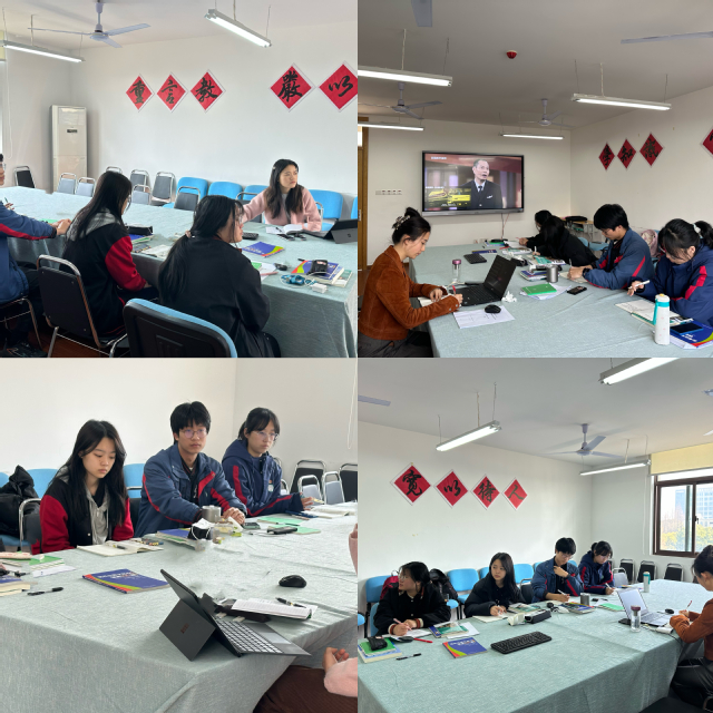 集训开始之后,从早晨到深夜,从早上八点半到晚上八点,指导老师和参赛选手都按照训练计划齐聚C区407,他们时而讨论听说模块的答题逻辑和技巧,时而探讨应用文写作的要求和规范,时而眉头紧锁,时而开怀大笑。选手们的听说读写能力就在这日常训练中有所进益。