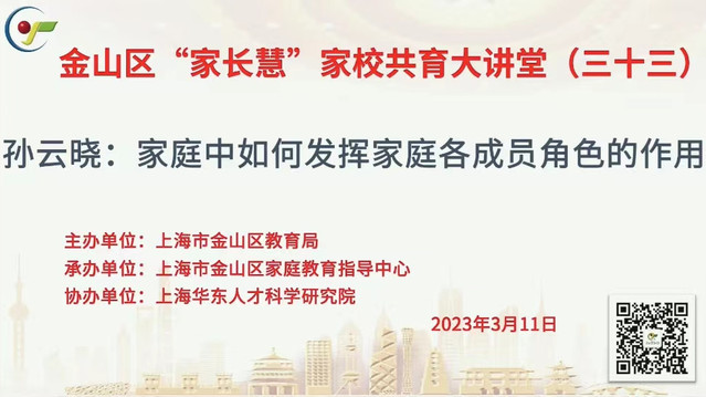 为帮助学生父母和其他监护人明确家庭教育的主体责任,发挥家庭各成员角色的作用,3月11日晚七点,金山区教育局综合教育科、金山区家庭教育指导中心共同组织了题为“家庭中如何发挥家庭各成员角色的作用”的专题讲座,讲座由中国家庭教育学会副会长孙云晓老师以线上直播方式进行,经贸学院各班级组织学生及其家长共同参与此次交流活动。