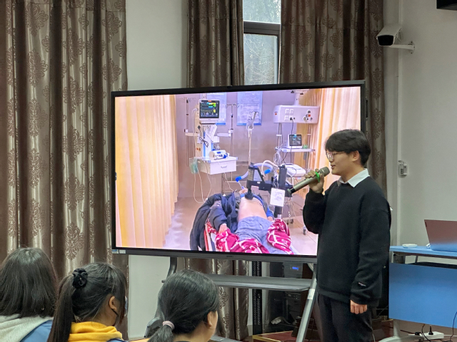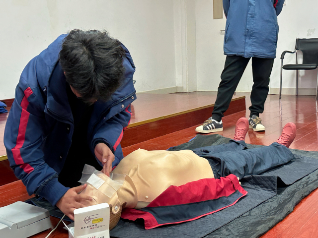 培训会上,江显锋以理论授课与现场实操训练的方式,结合医院队伍工作日常特点和实例,分别从人文关怀、CPR操作要点、手卫生的重要性、心电图基础操作等方面,进行了全面细致的讲解和指导。校青协会副会长、金山区红十字急速救援队队员夏盈春同学向同学们演示了AED的操作要点使用流程和艾姆利克急救法,帮助同学们在志愿服务的突发情况和常规操作中能更快、更好、更有效地做出应急反应及个人防护,提升自身的应变能力、自我防护能力及服务专业水准。