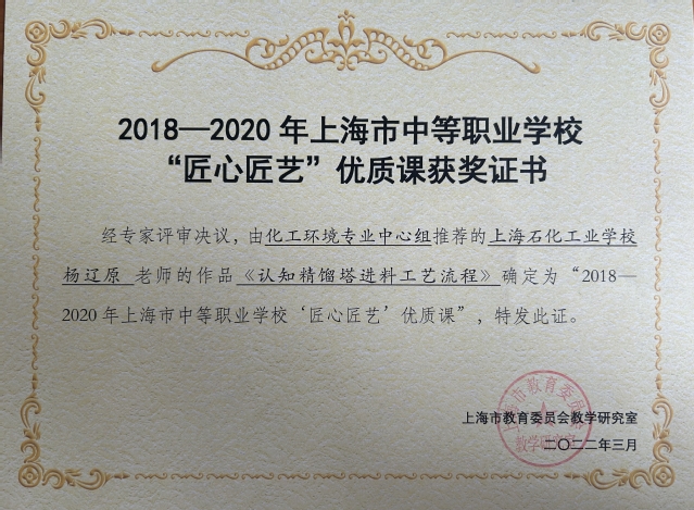 日前,学校收到由上海市教育委员会教学研究室颁发的2018-2020年上海市中等职业学校“匠心匠艺”优质课获奖证书,我校俞婕和杨辽原的作品均获评此奖。