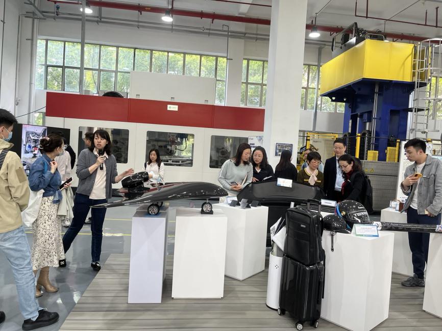 最后,参会人员一起参观了上海碳纤维复合材料创新研究院工程中心。该中心设有模压注塑自动化成型系统、自动化模压成型系统、复合材料自动化铺丝机等工艺示范线以及碳纤维复合材料应用展区。