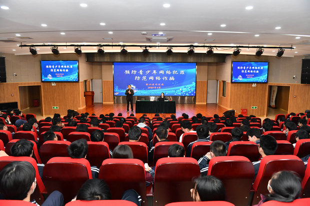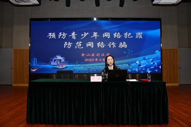 为进一步加强青少年法治教育,增强青少年法治意识和法治观念,提升其自我保护能力,4月26日下午,我校法治副校长—金山区司法局执法监督科科长丁玥为我校学生带来一堂以预防青少年网络犯罪防范网络诈骗为主题的安全教育宣传课。本次专题教育由安保处主任潘志东主持,部分班级学生在会议中心主会场参加,其余各班在教室收看直播。