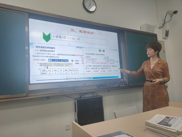 接着,周红老师从课题分析、学情分析、教学设计的思路、教学效果及反思几个方面进行了的说课。周老师对课题做了精心研析,以翻转课堂的教学方式,让课前学生自学,课中进行预习检测及纠错,对于变形铝合金的牌号及用途教学重点,用生活中易拉罐、航空航天工业中飞机起落架部件等举例,利用学生的感性认识加深学生的理解,分步递进,边讲边练。教学过程中加入了思政教育,如由易拉罐讲到它的可回收利用,进行保护环境、节约资源的教育;由铜合金与铝合金的价格,给学生输入成本意识,避免过分浪费;在讲授铝合金牌号时,补充介绍国际标准牌号,引导学生细心观察和标准规范意识,体现了润物细无声的专业课程思政。