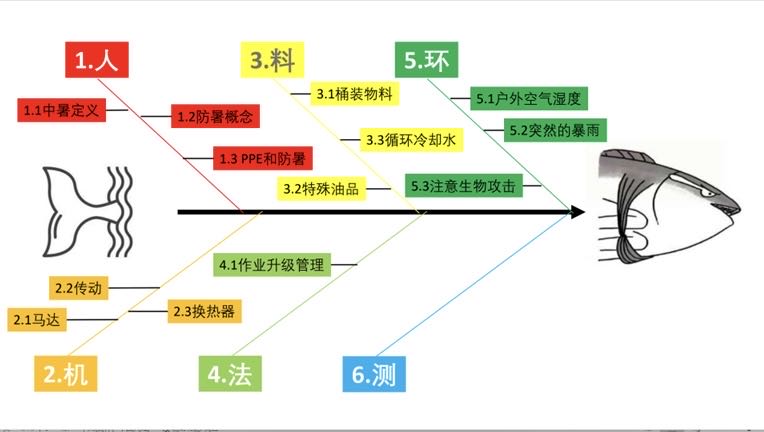 接下来,俞亮通过鱼骨图,从人、机、料、法、环、测六个方面讲解了化工厂高温天操作注意事项。