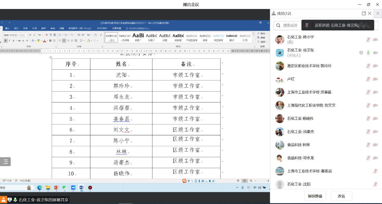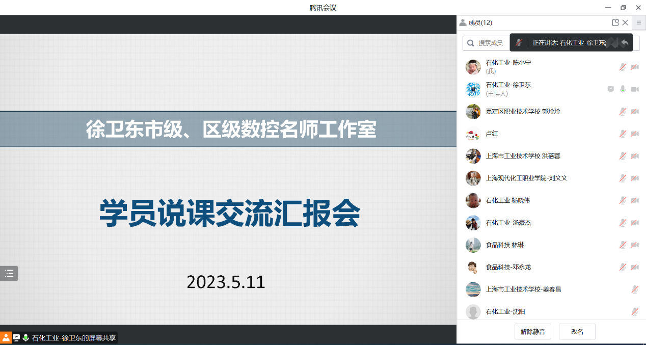 为了更好的提升学员的教学能力,徐卫东市、区两级“名师工作室”与2023年5月11日晚上19:00—21:30举行了线上学员说课交流汇报活动,会议由“名师工作室”主持人徐卫东主持,市、区两级“名师工作室”10位学员全员参加,会议特别邀请了来自嘉定大众工业学校的正高级讲师卢红作为指导专家。