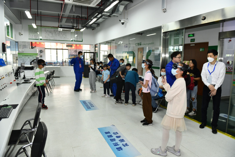 在体验活动中,学生们通过AR眼镜认知化工生产中各类装置的内部结构、工作原理,与虚拟讲解员互动解题,体验课本上的化学实验如何落地到实际生产中去;通过MR眼镜,查看碳二加氢制备乙烯装置内的物料流动路径,设备内物料的冷热变化、化学反应过程中分子结合动画,体验使用MR眼镜进行手势操作互动的乐趣。