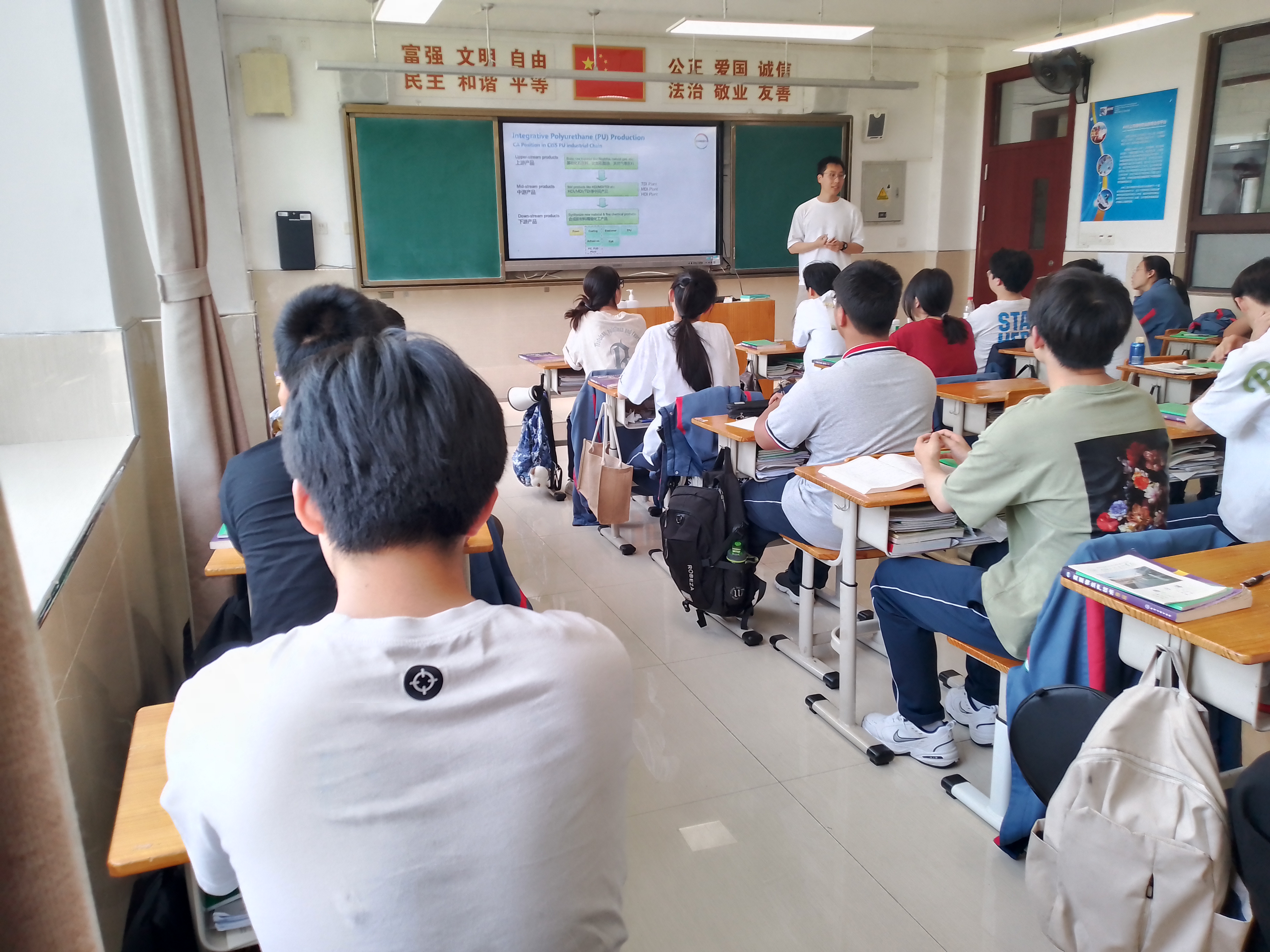 接着贾翔飞从PIC和PUD两大生产工艺出发详细讲解了本次公开课的教学内容,整个工艺流程包括预聚反应、扩散反应、混合、包装等单元工段。这部分内容是本学期开设课程《聚合技术》中的教学内容,PU更是科思创公司的主要产品,因此本节课PU的生产工艺同学们非常感兴趣。