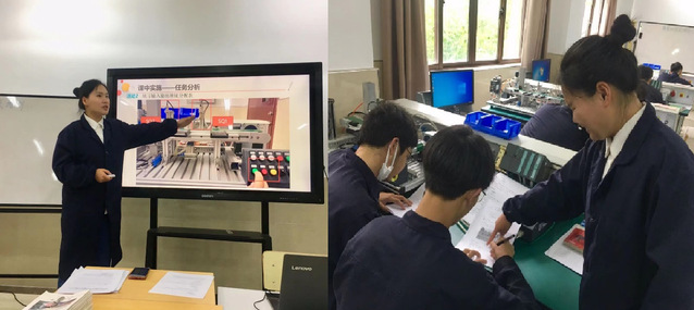 陈老师在课前通过学校网络学习平台让学生对相关知识点进行预学,课中以任务为引领,从任务发布、任务分析、任务计划、任务实施、任务评价进行课堂教学。在任务发布环节,由录制的校园大门开关视频引入学习内容,并结合实训设备,提出本次课需要完成的具体工作任务——用皮带轮正反转模拟校园大门的开关移动状态,用光电传感器和电感传感器模拟校园大门的限位开关,用实训台上的三个按钮模拟校园大门开、关、停止按钮,编写程序实现校园大门开关控制设计。随后通过学生自学查找资料结合课前预学以及老师的讲解对本次课新知内容常开触点、常闭触点、线圈基本位逻辑指令的认识及应用进行教学,接着根据任务要求,与学生一起探讨分析控制要求,让学生对照实训设备地址表,完成输入输出地址表的填写。在此基础上学生两人一组根据控制需求,讨论程序设计并根据老师自制软件操作视频进行硬件组态、程序编写完成仿真,并进行方案的展示交流,最后将设计结果在实训工作台上进行搭接调试运行。在授课过程中,采用信息化教学手段,利用鸿合多屏互动软件的影像上传功能以及直播功能,实时对学生学习及操作情况进行展示反馈与评价,学生积极参与课堂互动,课程任务完成情况良好。