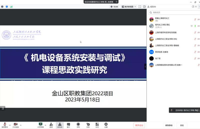 为进一步推进金山区职教集团课题《机电设备系统安装与调试课程思政实践研究》建设,推进课程思政进课堂,实现课程思政潜移默化、润物细无声的效果,2023年5月18日19:00-20:00,在课题主持人周红老师的精心策划组织下,召开了线上课程思政教学设计优化及视频拍摄指导会。会议由智能制造学院周红老师主持,课题组相关成员参加。邀请上海科创职业技术学院刘恒娟、朱广跃两位专家指导优化教学设计,熙泽信息沈家劲等两位技术支持参与活动。
