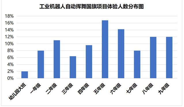 工业机器人自动挥舞国旗项目以了解工业机器人结构功能和体验工业机器人操作技能为主,让体验者在操作控制机器人挥舞国旗的过程中感知国旗舞动的美丽和自豪,152位体验者从幼儿园大班至九年级,学龄段跨度大,年龄层次丰富,体验完成后家长和学生均表示机器人挥舞国旗非常有意思,活动过程增强了学生爱国情怀,加深了学生对工业机器人应用的认知。