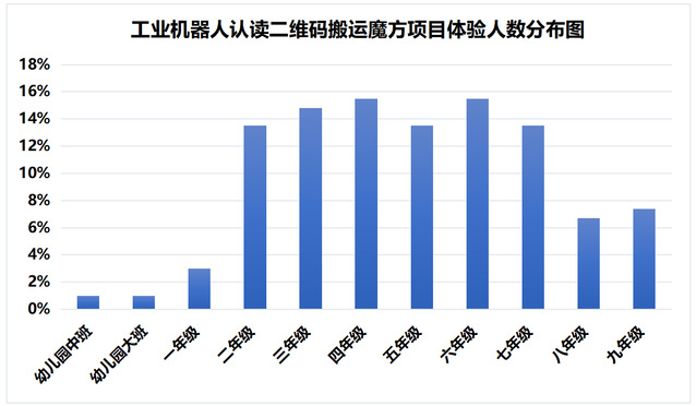 工业机器人认读二维码搬运魔方项目以视觉技术为基础,模拟实际工厂车间机器人的工作流程。体验者使用触摸屏选择搬运的物料块,机器人自动搬运物料、识别二维码、识别物料序列并放置在二维码对应的货架上,在此过程中提升体验者对人工智能、智能制造的兴趣及工业机器人实际应用场景和工作内容的认知。148位体验者学龄段主要集中于二年级至七年级,且部分体验者具有一定的编程基础,完成体验后大部分学生表示对视觉、二维码识别感兴趣,希望下次再来体验和学习。