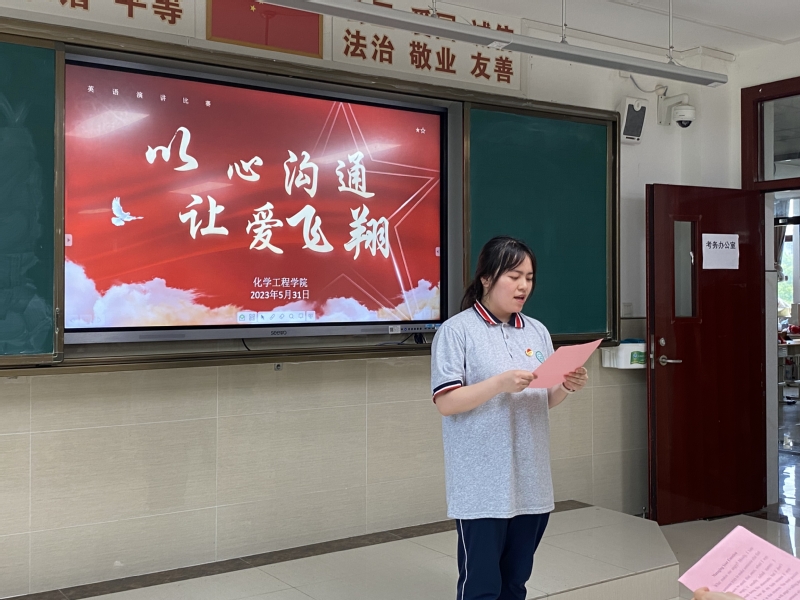 为深入学习贯彻党的二十大精神,强化广大青年学生关注心理健康、提高心理素质的意识,引领广大青年学生学会沟通,促进学生与家人、老师、朋友间的交流,让学生成长为踔厉奋发的新时代新人,化学工程学院于5月31日,开展“以‘心’沟通,让‘爱’飞翔”为主题的英语演讲比赛预赛。