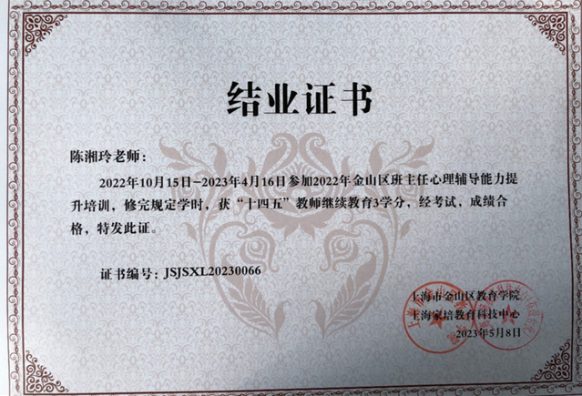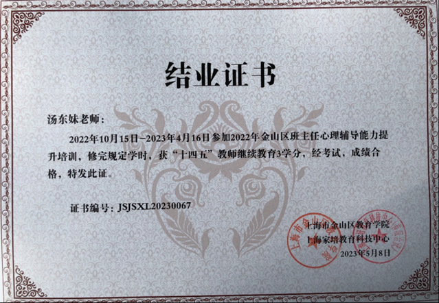 2023年5月,由金山区教育学院举办的金山区班主任心理辅导能力提升培训圆满落幕。本次培训班时间为2022年10月至2023年4月,我校汤东妹和陈湘玲老师参加了此次培训,通过学习、交流和考核,提升了自身的心理辅导能力,并成功获得了培训证书。