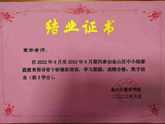 为贯彻落实习近平总书记关于家庭教育的重要论述,深入学习《中华人民共和国家庭教育促进法》,有力提升全区家庭教育工作水平,金山区教育学院于2022年6月组建了第二期家庭教育研修班,我校教师章芹参加了本期的学习活动,并顺利结业。