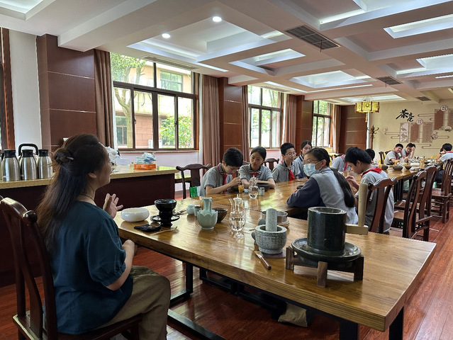 中国茶史上有“茶兴于唐,盛于宋”的说法,宋代点茶在中国茶道史上具有极其重要的地位。点茶是将茶碾成细末,置于盏中,以沸水点冲。先注少量沸水调膏,继之量茶注汤,边注边用茶筅击拂,点出丰富的沫浡,在沫浡上以茶膏作画,即“能喝的宋画”。宋代点茶项目通过“三汤法”和《大观茶论》中“七汤法”的演示和学习,以及“水丹青”的介绍,让同学们感受到了宋代茶文化的魅力。