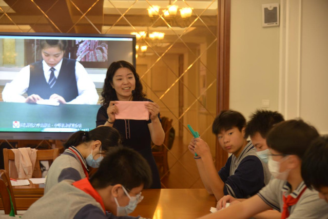 “餐饮服务与管理”职业体验项目则让同学们体验了餐巾折花。“孔雀开屏”、“双蝶并舞”、“风荷雅韵”、“马蹄双莲”、“温馨烛光”、“碧波小鱼”……一张张普通的餐巾,在学生们的手里生出了各式各样美丽的“花”。