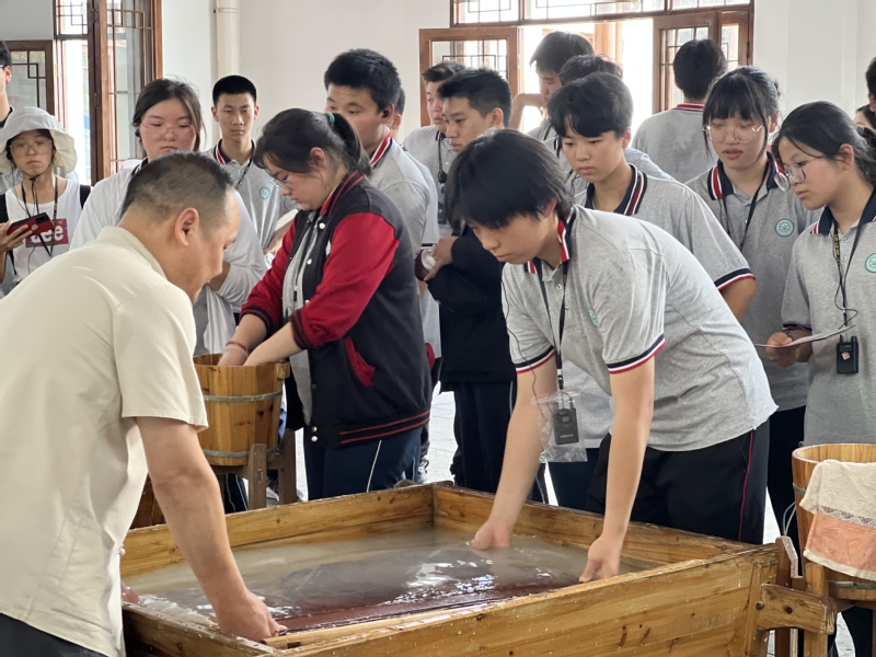 学子们参观完一道道制作宣纸的必备工艺,并在师傅们的帮助下认真完成一张张宣纸的制作,学子们脸上都洋溢喜悦之情。
