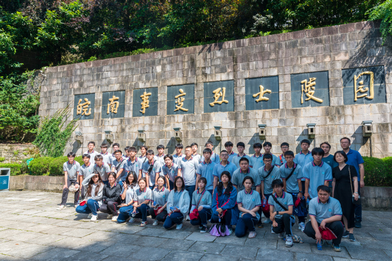 6月28日,红色研学活动第二天,师生们来到了皖南事变烈士陵园。进入陵园,沿台阶行约30米,有一小型广场,正对面挡土墙上镶嵌由叶飞题写“皖南事变烈士陵园”字碑。