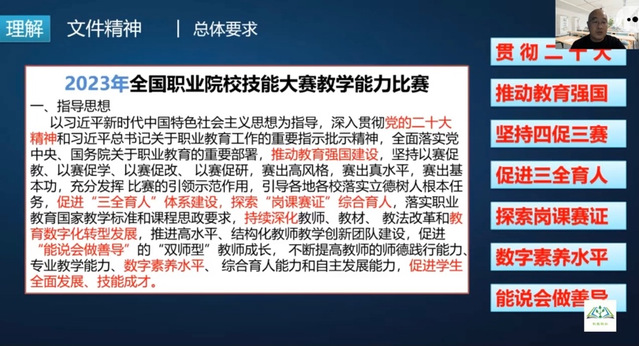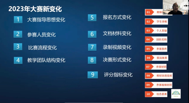 通过培训,我们及时了解了2023年大赛在比赛内容、分组、流程、奖励办法、参赛材料、课堂实录视频、决赛程序等主要方面与以往大赛相比所作的调整和变更。专家分别从这些方面进行了详细地讲解。今年大赛在指导思想和比赛内容、决赛答辩中都多次强调提高教师“数字素养”的相关内容。可以说这是今年大赛的一个全新亮点。