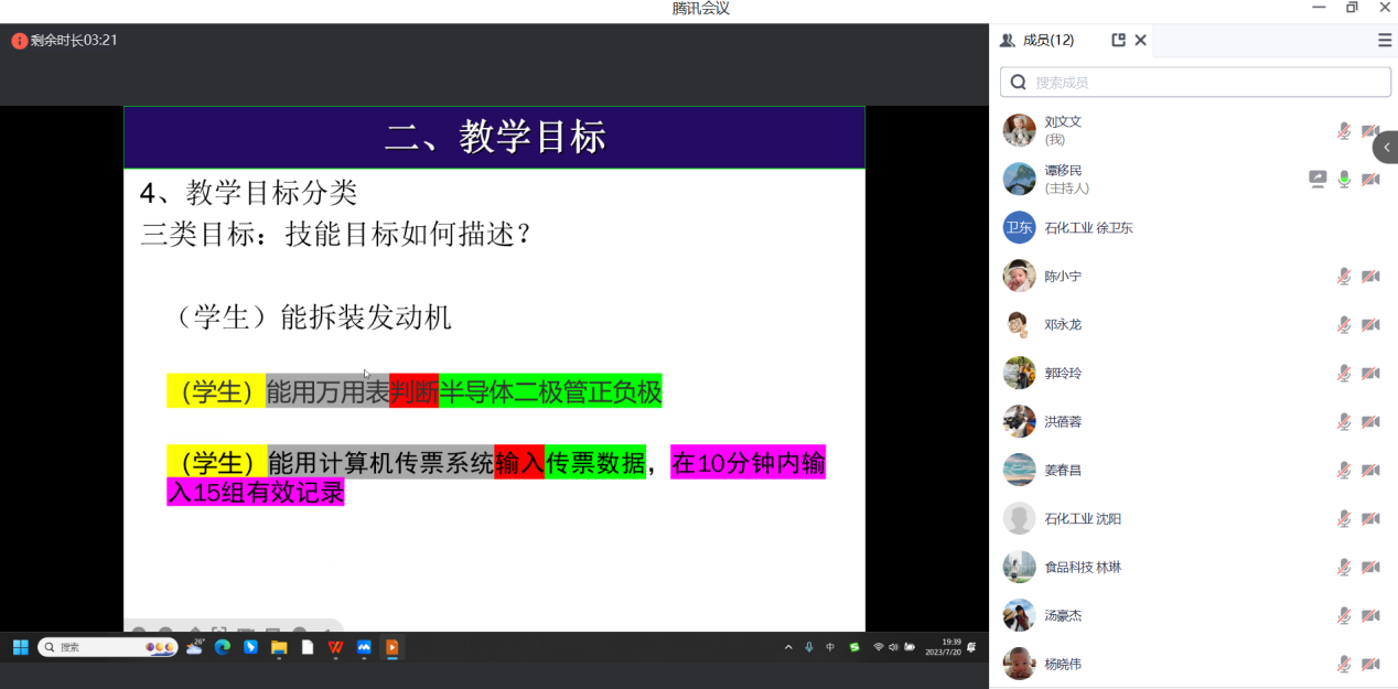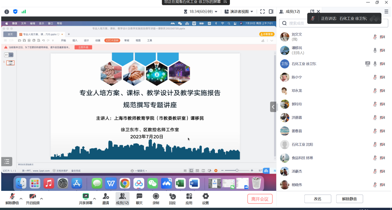 为进一步提升市、区两级工作室学员的教学水平和教学质量,进一步明确人培方案、课标、教学设计及教学实施报告之间的逻辑关系以及相关文件的规范撰写要求,7月20日晚上7:00-9:00,工作室特邀请了上海市教师教育学院(市教委教研室)谭移民老师开设了专业人培方案、课标、教学设计及教学实施报告规范撰写专题讲座。该讲座旨在帮助教师们深入了解和掌握教学规范撰写的要点和技巧,提高他们的教学设计和教学实施能力。徐卫东市、区两级数控名师工作室的全体成员参加此次线上专题讲座。